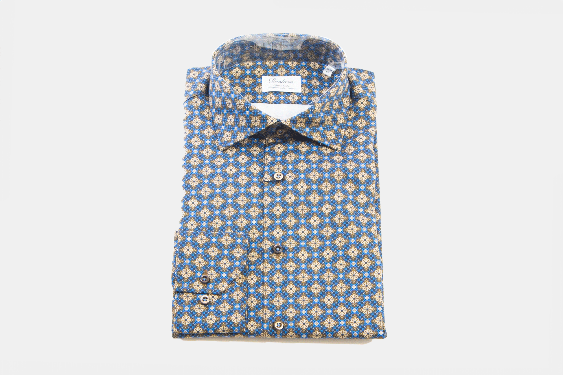 blue casual shirt in a fitted body model with floral pattern, made of 100% cotton detailed with beige mother of pearl buttons and long sleeves.